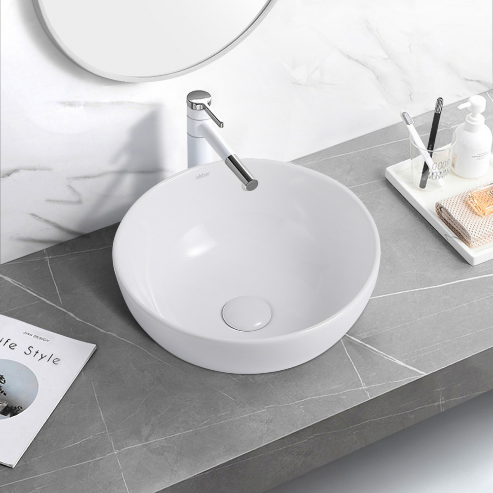 Abber Bequem Раковина накладная круглая 36x36x14,5h см, цвет: белый AC2105 и другие сантехнические изделия бренда характеризует надежность, высокое качество и продолжительный срок службы. Изделие в стилистике минимализм впечатляюще будет смотреться в различных цветовых решениях помещения.
