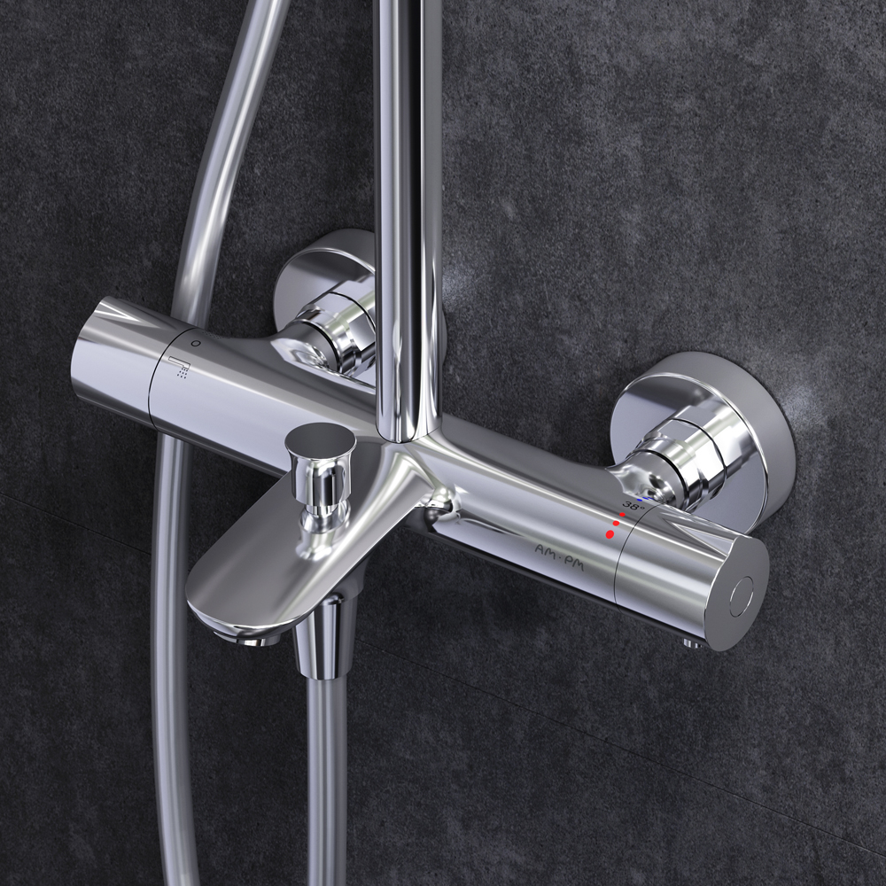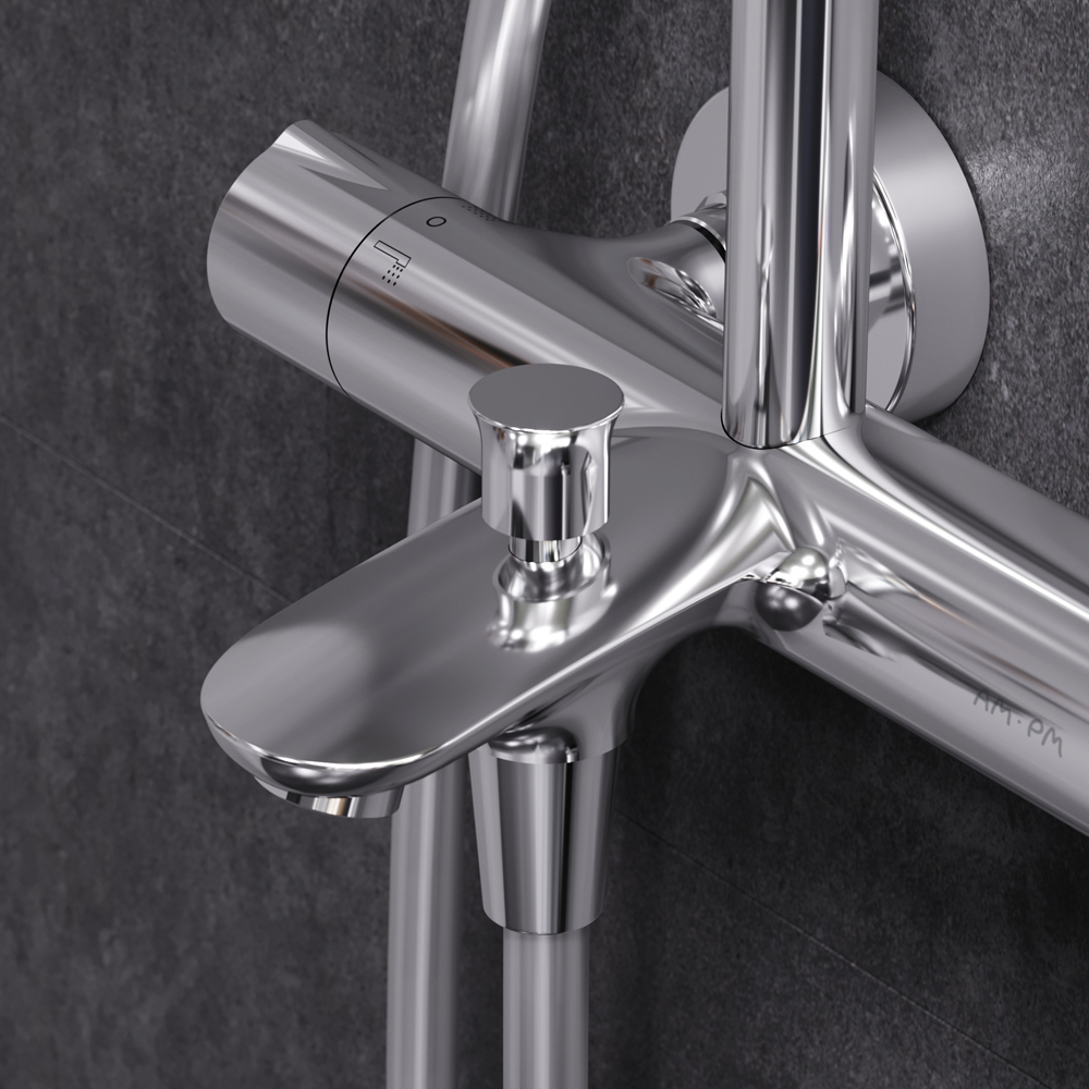 Am.Pm Gem Душевая стойка с верхним душем, цвет: хром F0790520 и другие сантехнические изделия бренда характеризует надежность, высокое качество и продолжительный срок службы. Изделие в стилистике минимализм впечатляюще будет смотреться в различных цветовых решениях помещения.