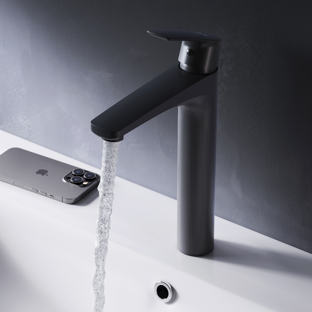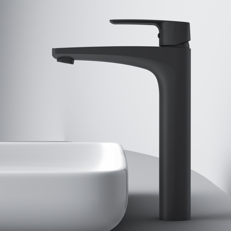 Am.Pm Gem Смеситель для раковины высокий на 1 отверстие, без д/к, излив 15,5 см, цвет: черный мат. F90A92022 и другие сантехнические изделия бренда характеризует надежность, высокое качество и продолжительный срок службы. Изделие в стилистике минимализм впечатляюще будет смотреться в различных цветовых решениях помещения.