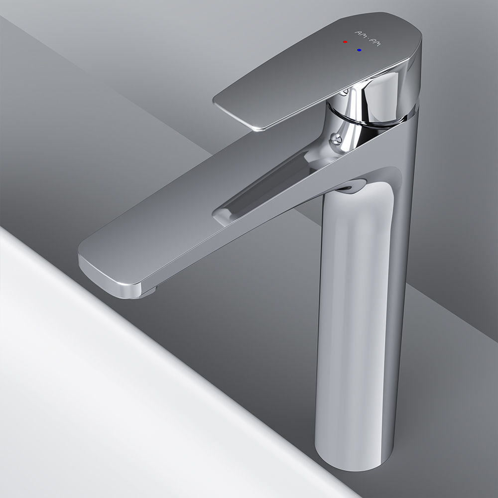Am.Pm Gem Смеситель для раковины высокий на 1 отверстие, без д/к, излив 15,5 см, цвет: хром глянец F90A92000 и другие сантехнические изделия бренда характеризует надежность, высокое качество и продолжительный срок службы. Изделие в стилистике минимализм впечатляюще будет смотреться в различных цветовых решениях помещения.