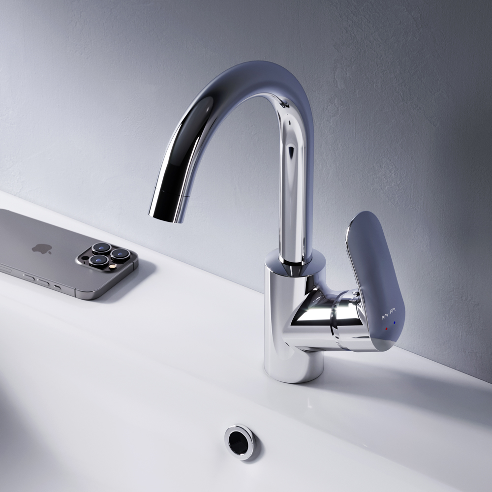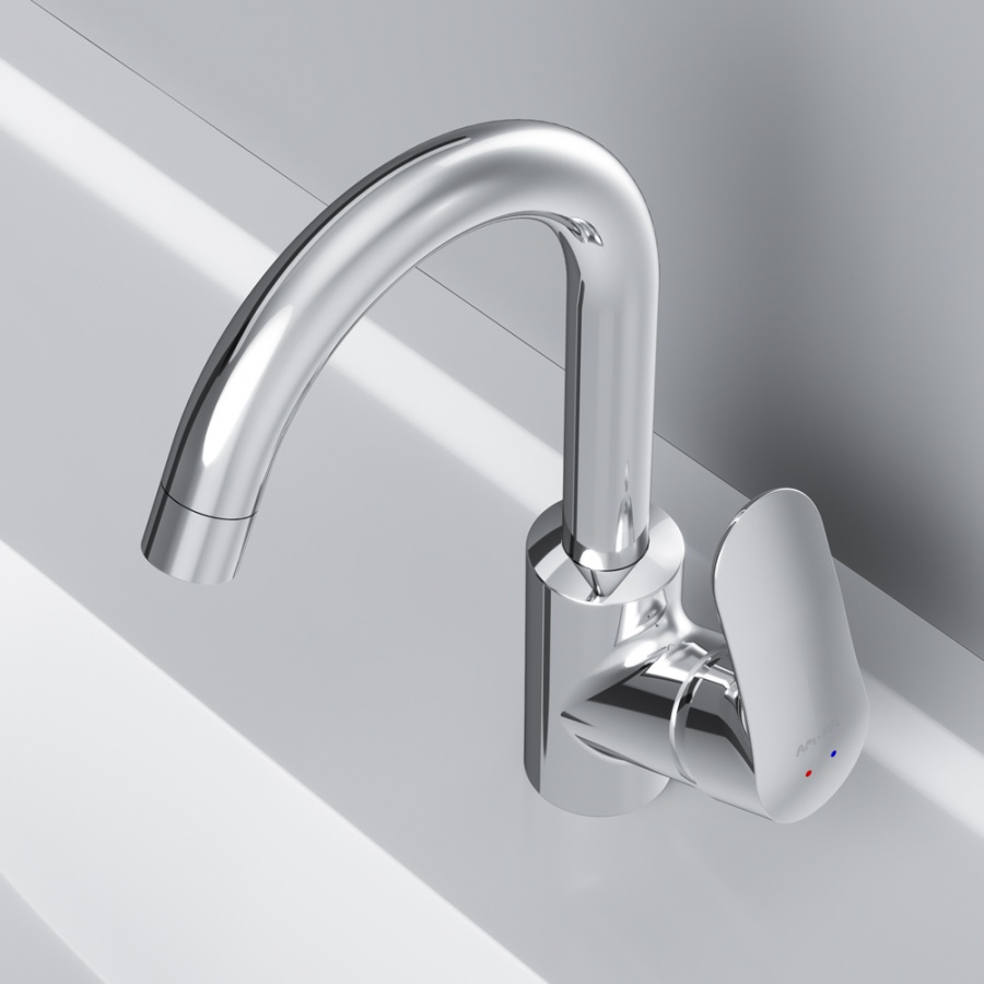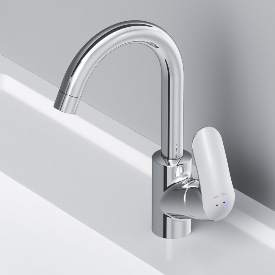 Am.Pm Like Смеситель для раковины на 1 отверстие, без д/к, длина излива 13,5 см, цвет: хром глянец F8002700 и другие сантехнические изделия бренда характеризует надежность, высокое качество и продолжительный срок службы. Изделие в стилистике неоклассика впечатляюще будет смотреться в различных цветовых решениях помещения.