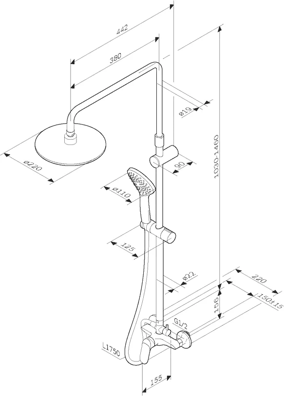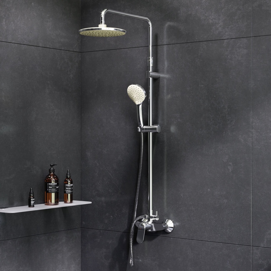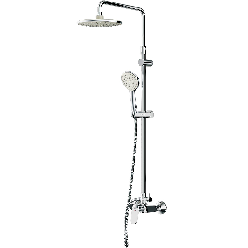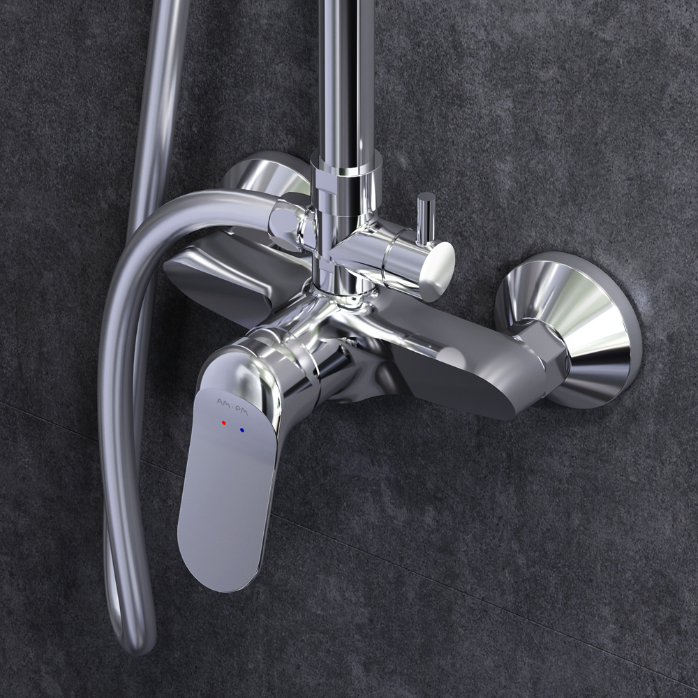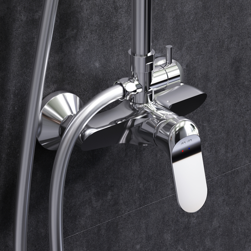 Am.Pm Sunny Душевая стойка: смеситель, верхний и ручной душ, шланг, цвет: хром глянцевый F0785C800 и другие сантехнические изделия бренда характеризует надежность, высокое качество и продолжительный срок службы. Изделие в стилистике минимализм впечатляюще будет смотреться в различных цветовых решениях помещения.