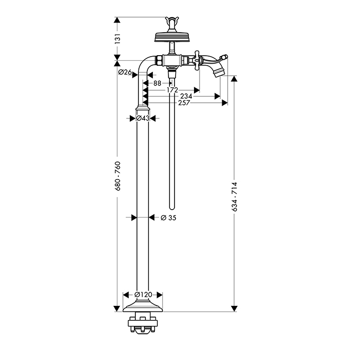 Axor Montreux Смеситель для ванны напольный с двумя крестообразными рукоятками, цвет: шлиф. бронза 16547140 и другие сантехнические изделия бренда характеризует надежность, высокое качество и продолжительный срок службы. Изделие в стилистике английская классика впечатляюще будет смотреться в различных цветовых решениях помещения.