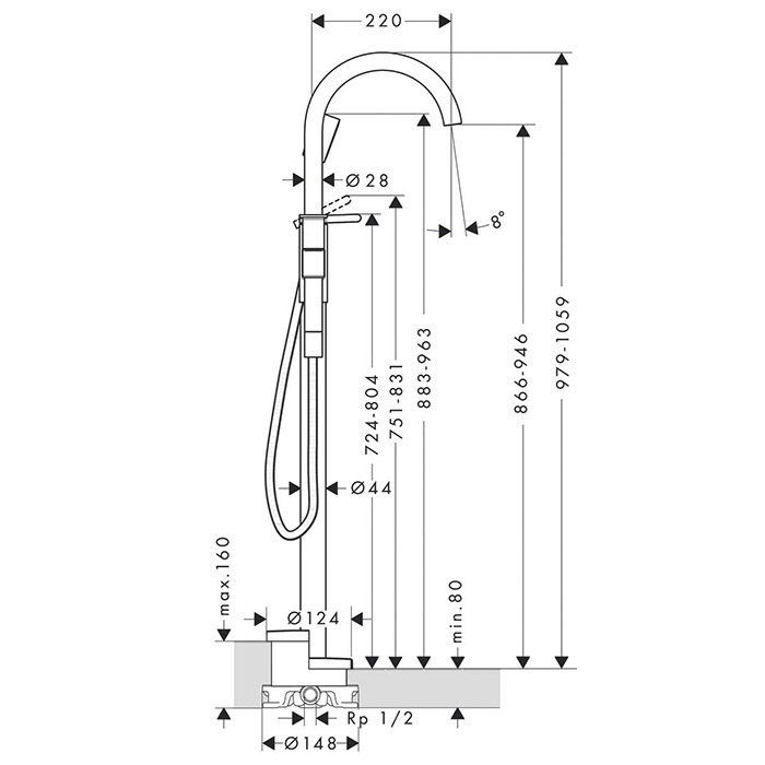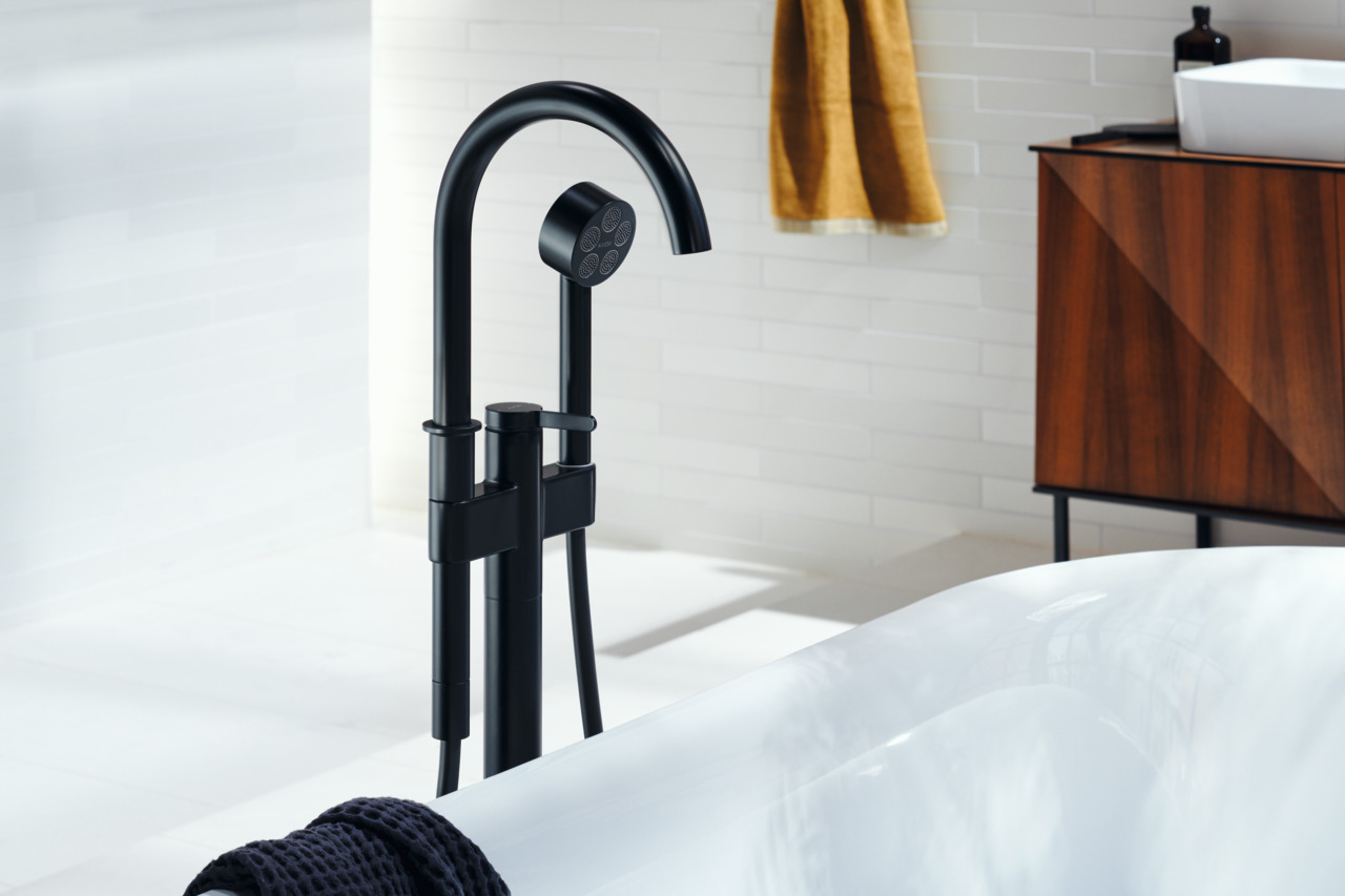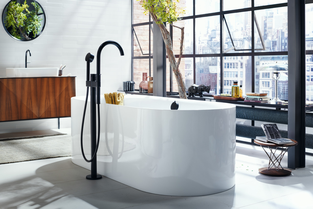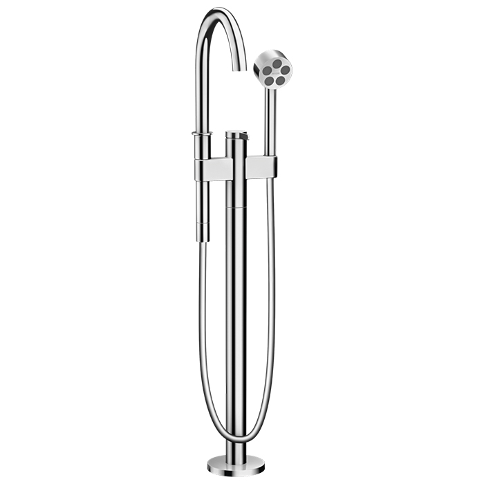Axor One Смеситель для ванны, напольный, однорычажный, с ручным душем, цвет: хром 48440000 и другие сантехнические изделия бренда характеризует надежность, высокое качество и продолжительный срок службы. Изделие в стилистике hi-tech впечатляюще будет смотреться в различных цветовых решениях помещения.
