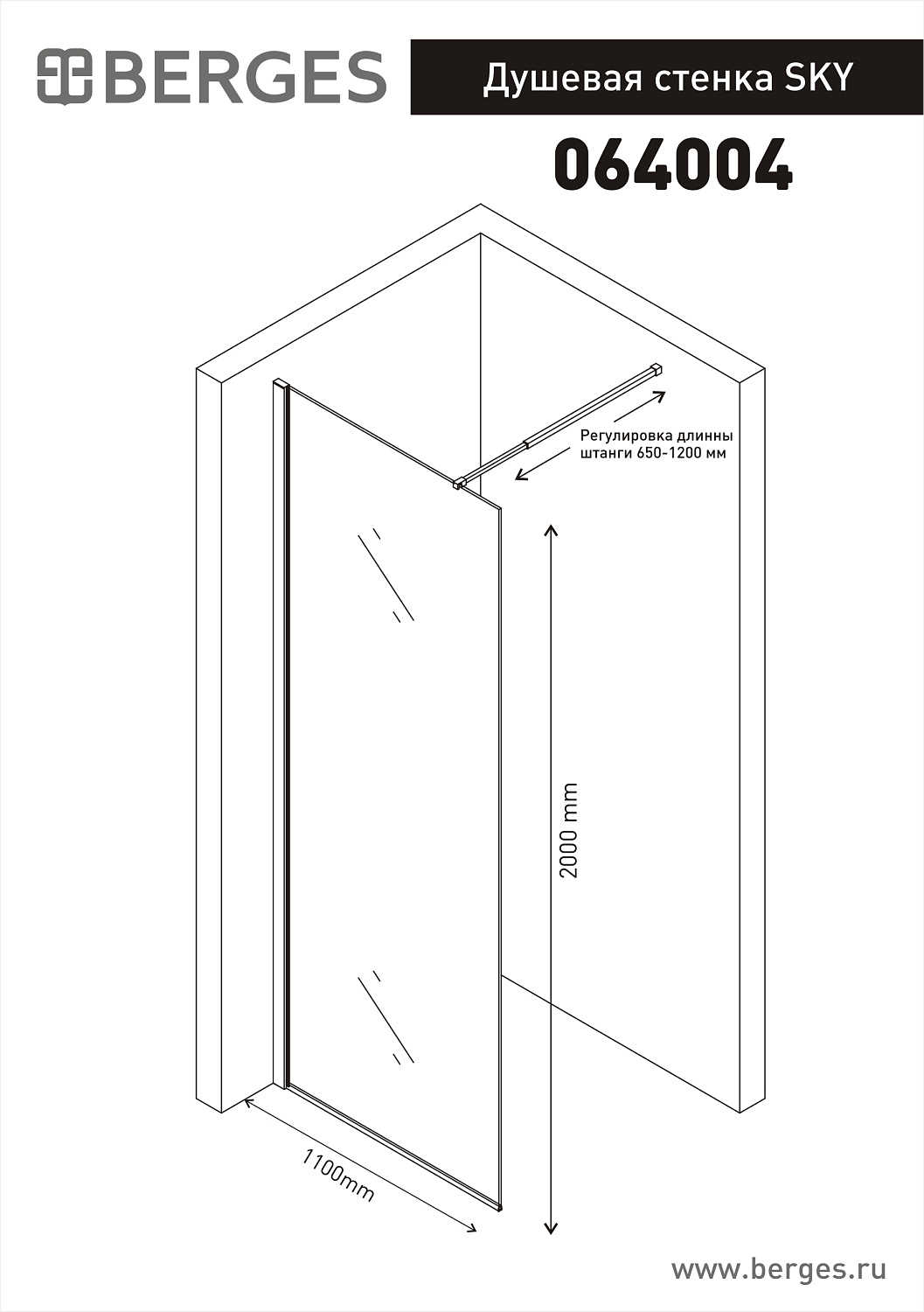 Berges Sky Душевая стенка 110х200h, цвет хром сильвер 064004 и другие сантехнические изделия бренда характеризует надежность, высокое качество и продолжительный срок службы. Изделие в стилистике минимализм впечатляюще будет смотреться в различных цветовых решениях помещения.