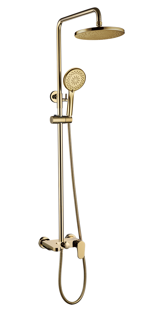 Boheme Spectre Душевая стойка: смеситель, ручной душ 5 видов струи, верхний душ 25 см, цвет: gold 458-G и другие сантехнические изделия бренда характеризует надежность, высокое качество и продолжительный срок службы. Изделие в стилистике минимализм впечатляюще будет смотреться в различных цветовых решениях помещения.
