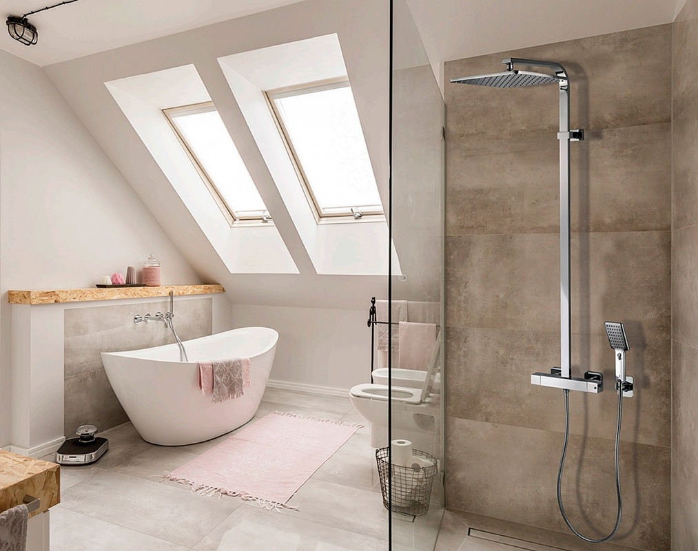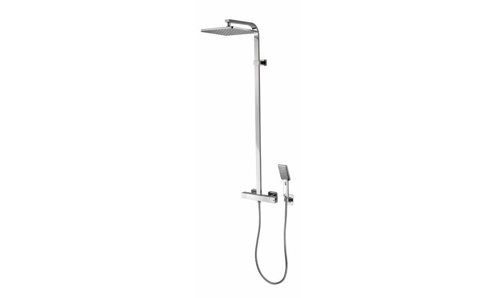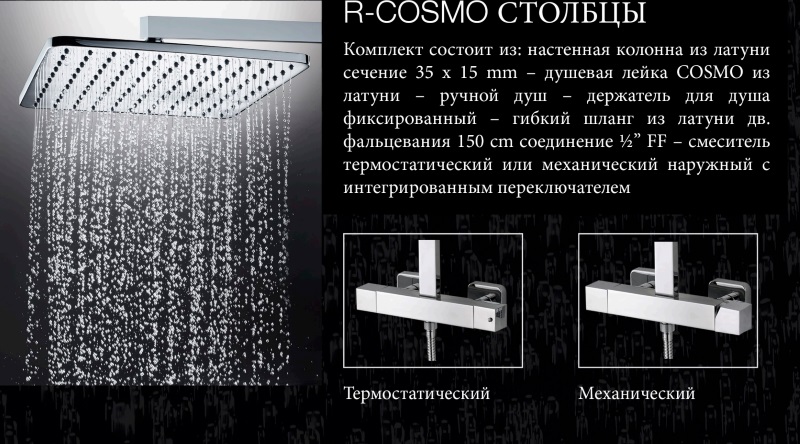 Bossini Cosmo Душевая стойка: смеситель, ручной и верхний душ, 1 вид струи, шланг, цвет: chrome L40001.030 и другие сантехнические изделия бренда характеризует надежность, высокое качество и продолжительный срок службы. Изделие в стилистике лофт впечатляюще будет смотреться в различных цветовых решениях помещения.