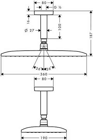 Hansgrohe Raindance E Верхний душ 36x19 см, 1 вид струи, кронштейн потолочный 10 см, цвет: хром 27381000 и другие сантехнические изделия бренда характеризует надежность, высокое качество и продолжительный срок службы. Изделие в стилистике hi-tech впечатляюще будет смотреться в различных цветовых решениях помещения.