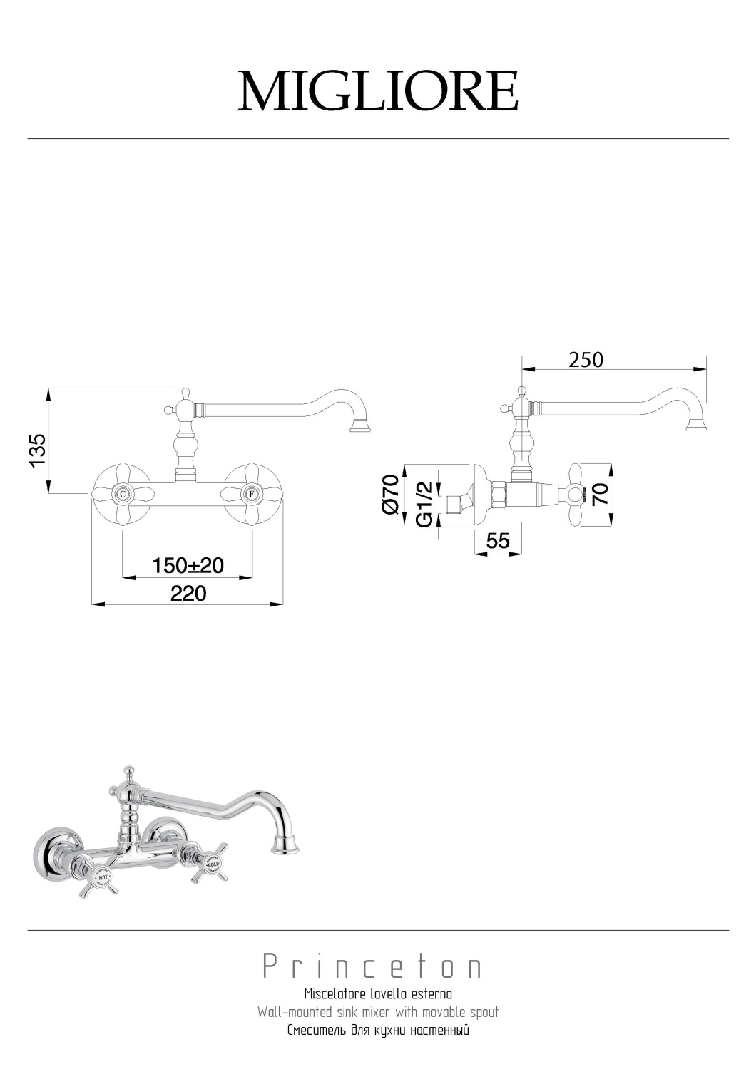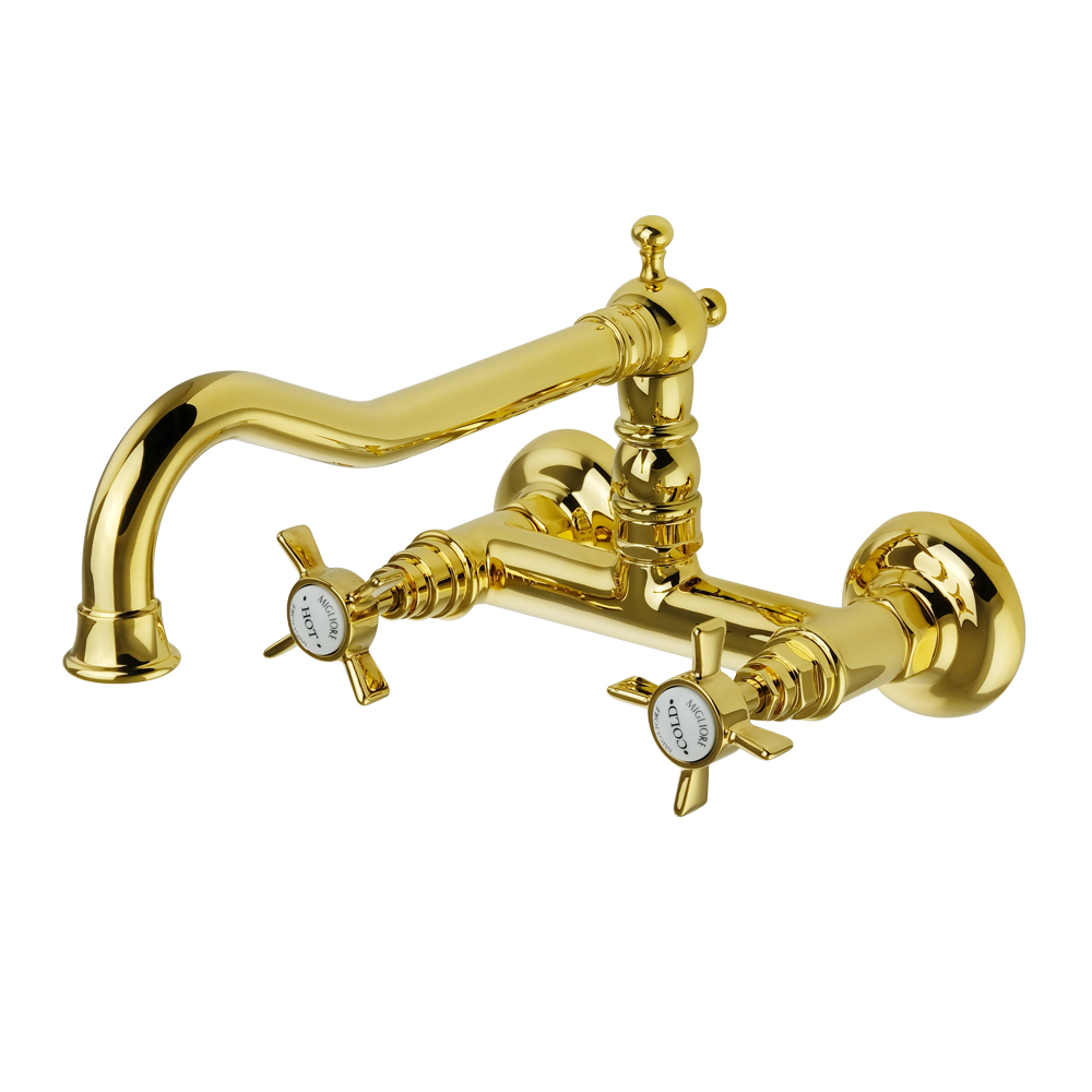 Migliore Princeton Cucina Смеситель для кухни настенный, цвет: золото 18280 и другие сантехнические изделия бренда характеризует надежность, высокое качество и продолжительный срок службы. Изделие в стилистике прованс впечатляюще будет смотреться в различных цветовых решениях помещения.