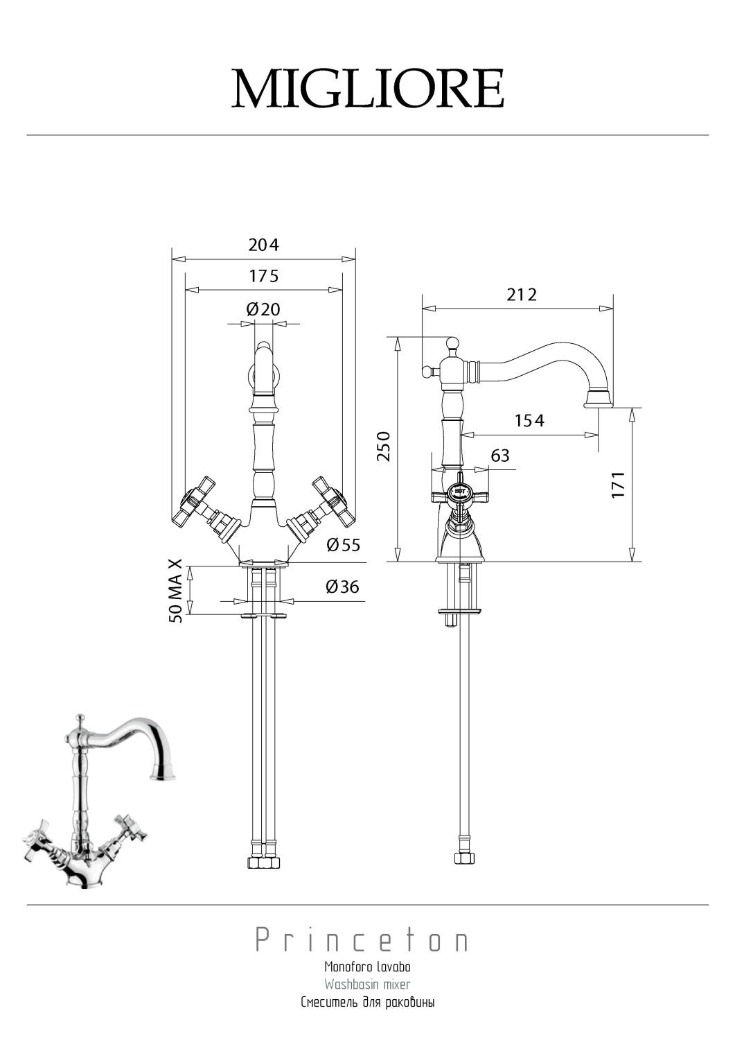 Migliore Princeton Смеситель для раковины, цвет: хром 19361 и другие сантехнические изделия бренда характеризует надежность, высокое качество и продолжительный срок службы. Изделие в стилистике английская классика впечатляюще будет смотреться в различных цветовых решениях помещения.