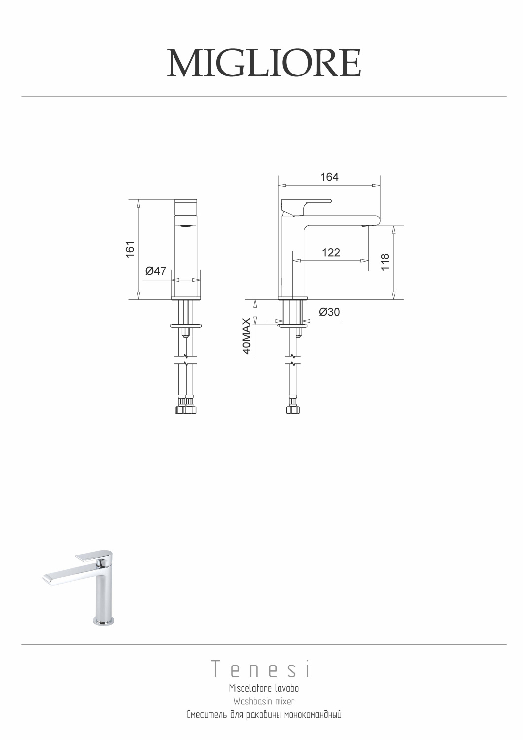 Migliore Tenesi Смеситель для раковины монокомандный, цвет: хром 25415 и другие сантехнические изделия бренда характеризует надежность, высокое качество и продолжительный срок службы. Изделие в стилистике минимализм впечатляюще будет смотреться в различных цветовых решениях помещения.