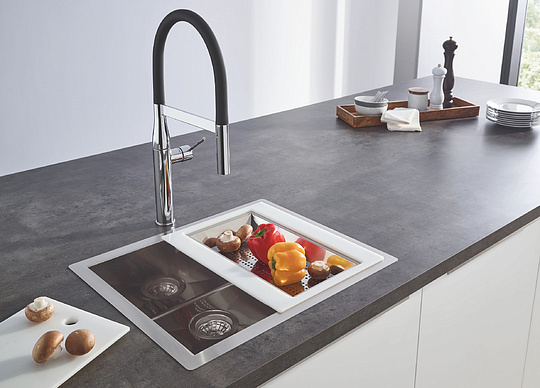 Grohe K700 Кухонная мойка из нержавеющей стали 56,4x20 см, с доп. чашей, цвет: нержавеющая сталь 31579SD0 и другие сантехнические изделия бренда характеризует надежность, высокое качество и продолжительный срок службы. Изделие в стилистике hi-tech впечатляюще будет смотреться в различных цветовых решениях помещения.