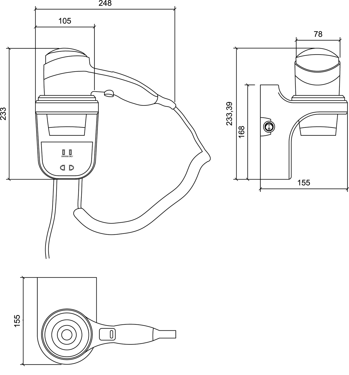Фен настенный белый 1800-2200 W. Корпус из белого пластика. Оборудован очень мощным двигателем до 2200W и розеткой для бритвы. В розетку кроме устройств для бритья можно подключать плойку для волос, зарядку для телефона и прочие электроприборы. Не предназначен для мест с большой проходимостью. Имеет несколько режимов работы. Устройство можно подключить к открытой или скрытой проводке. Аппарат имеет 2 режима работы.