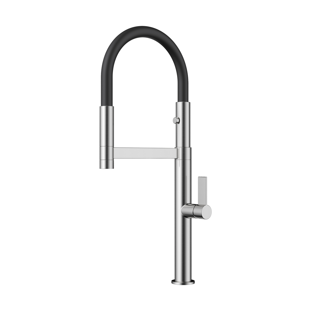 Omoikiri Osaka-BN-BL Смеситель для кухни с гибким изливом, цвет: нержавеющая сталь/черный 4994331 и другие сантехнические изделия бренда характеризует надежность, высокое качество и продолжительный срок службы. Изделие в стилистике лофт впечатляюще будет смотреться в различных цветовых решениях помещения.