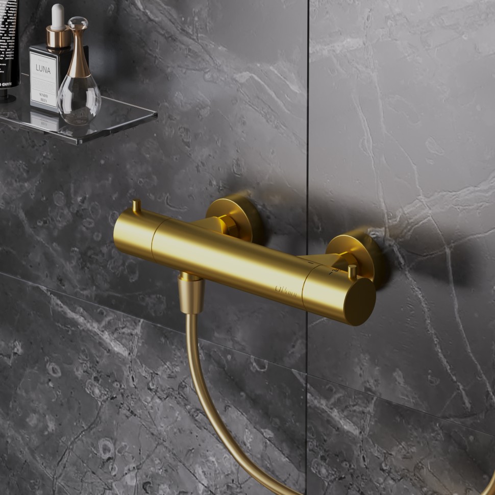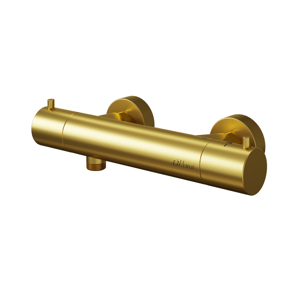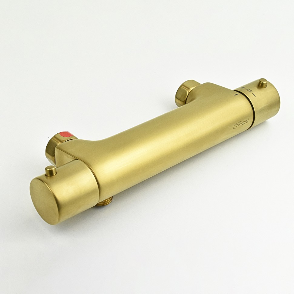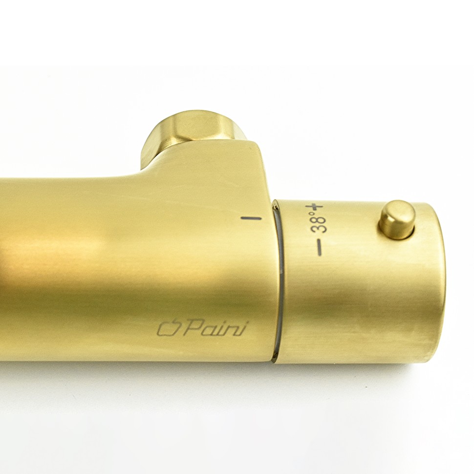Paini Cox Смеситель для душа с термостатом на 2 отверстия, цвет: золото брашированное 78PJ511TH и другие сантехнические изделия бренда характеризует надежность, высокое качество и продолжительный срок службы. Изделие в стилистике минимализм впечатляюще будет смотреться в различных цветовых решениях помещения.
