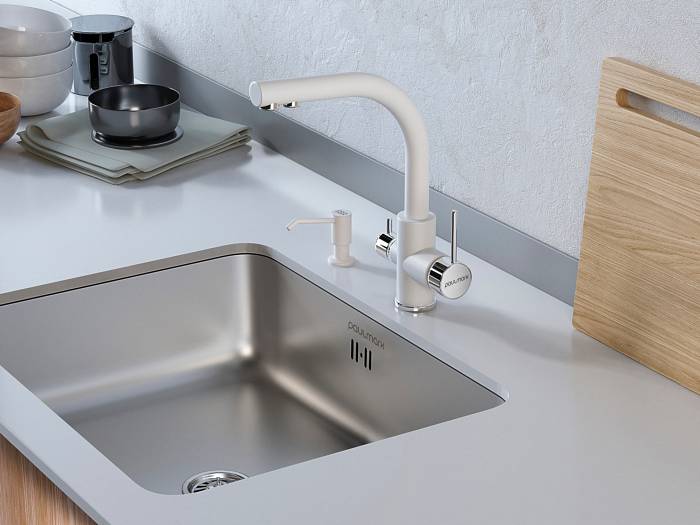 Paulmark Essen Смеситель для кухни с гибким изливом, цвет: белый матовый Es213011-431 и другие сантехнические изделия бренда характеризует надежность, высокое качество и продолжительный срок службы. Изделие в стилистике hi-tech впечатляюще будет смотреться в различных цветовых решениях помещения.