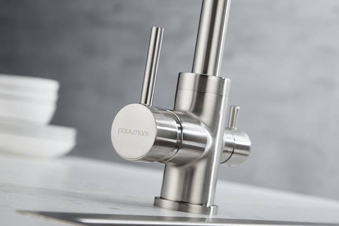 Paulmark Essen Смеситель для кухни с гибким изливом, цвет: никель Es213211-NI и другие сантехнические изделия бренда характеризует надежность, высокое качество и продолжительный срок службы. Изделие в стилистике лофт впечатляюще будет смотреться в различных цветовых решениях помещения.