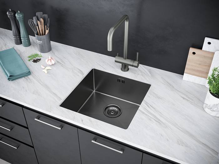 Paulmark Gerberg Кухонная мойка нержавеющая сталь 44x44 см, цвет: вороненая сталь PM214444-GM и другие сантехнические изделия бренда характеризует надежность, высокое качество и продолжительный срок службы. Изделие в стилистике hi-tech впечатляюще будет смотреться в различных цветовых решениях помещения.
