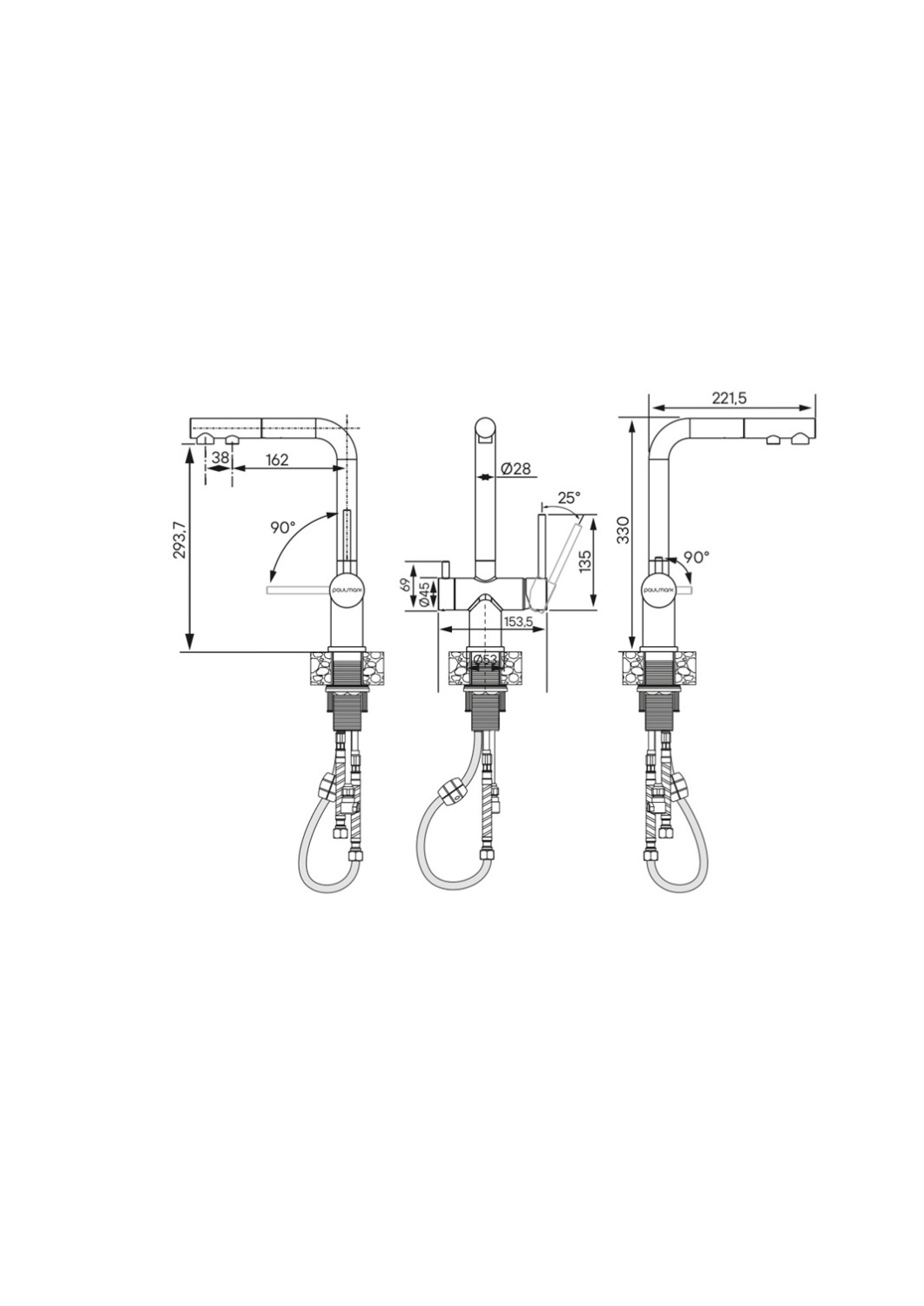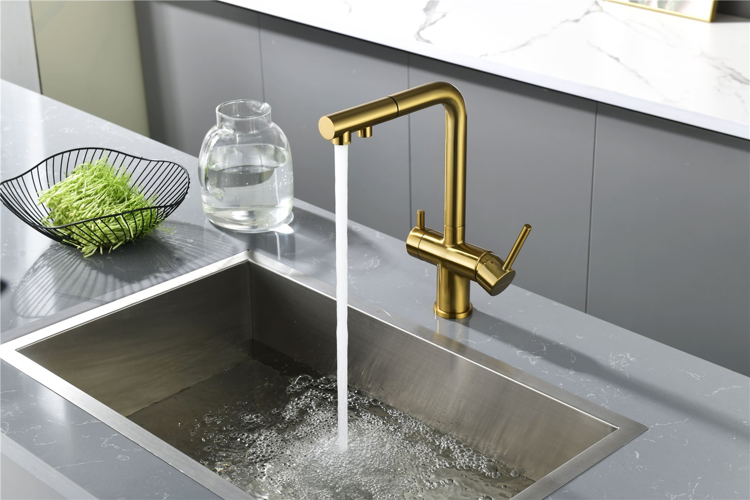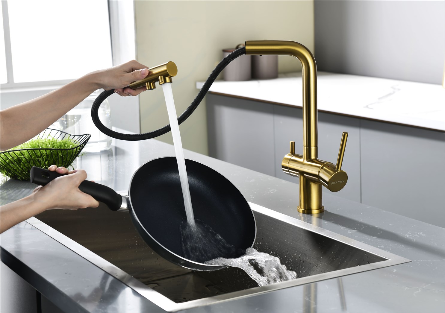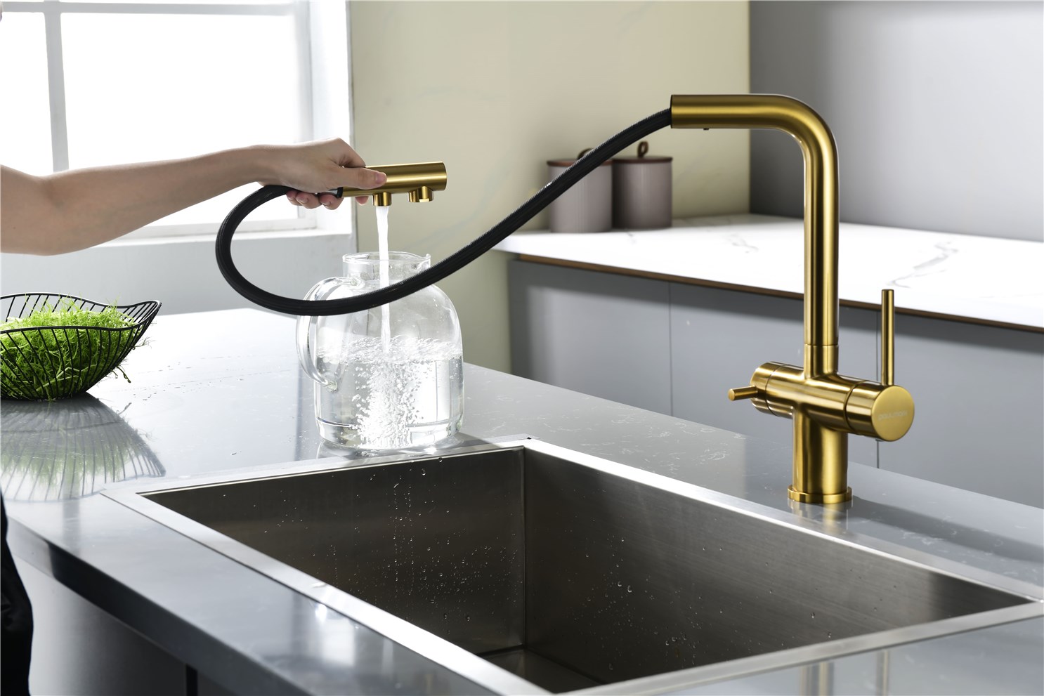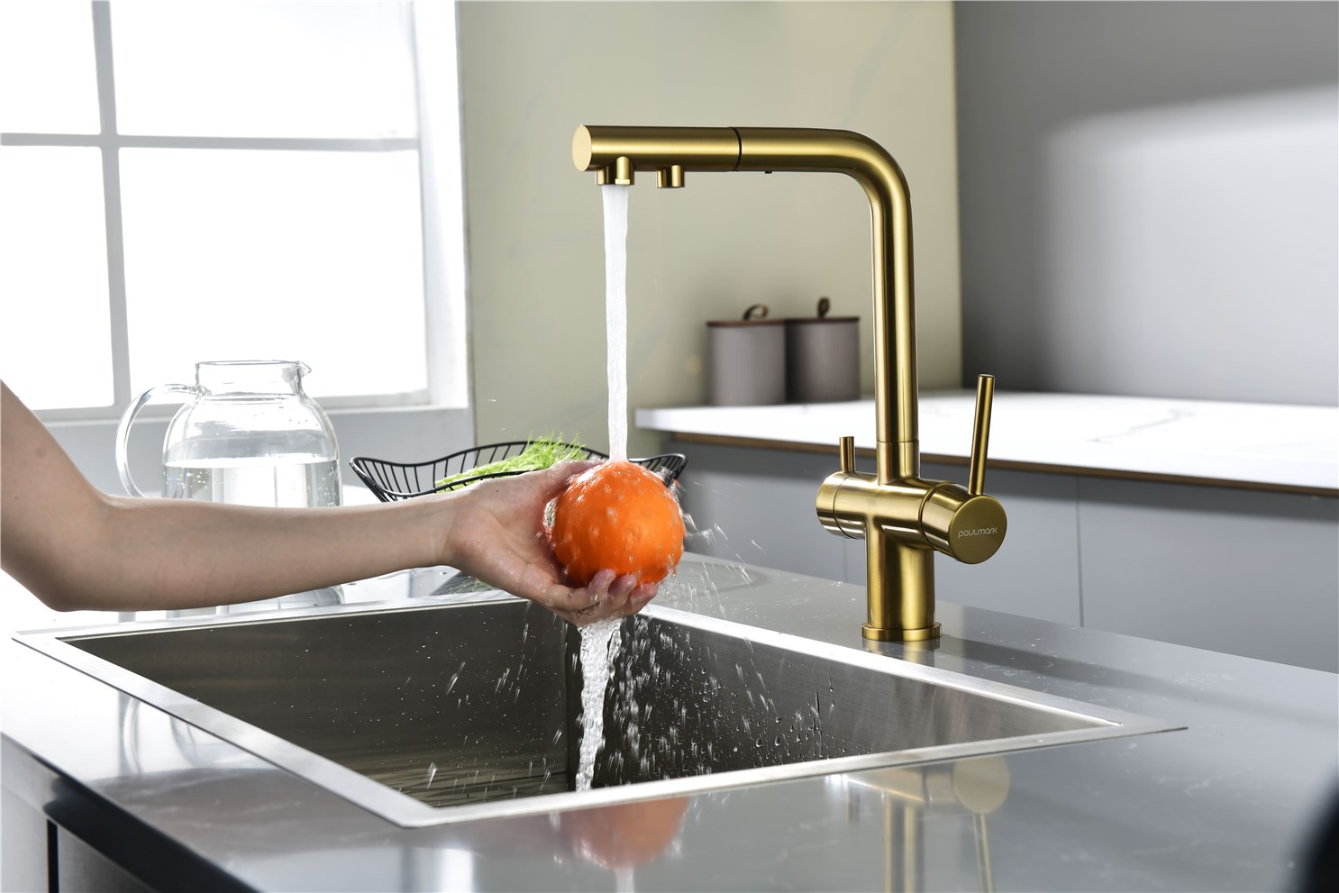 Paulmark Serpentine Смеситель для кухни с выдвижным изливом и подключ. фильтра, цвет: браш. золото Se213222-BG и другие сантехнические изделия бренда характеризует надежность, высокое качество и продолжительный срок службы. Изделие в стилистике минимализм впечатляюще будет смотреться в различных цветовых решениях помещения.