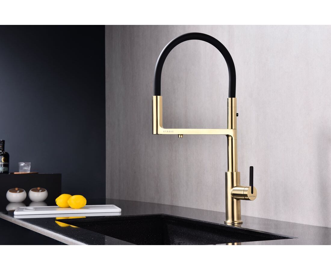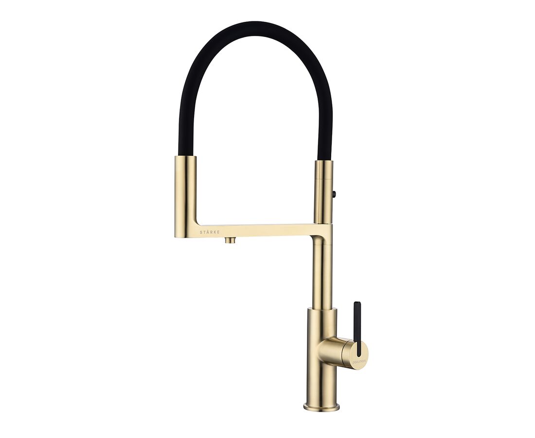 Paulmark Tornado Смеситель для кухни с гибким изливом, цвет: светлое брашированное золото To213402-SBG и другие сантехнические изделия бренда характеризует надежность, высокое качество и продолжительный срок службы. Изделие в стилистике минимализм впечатляюще будет смотреться в различных цветовых решениях помещения.