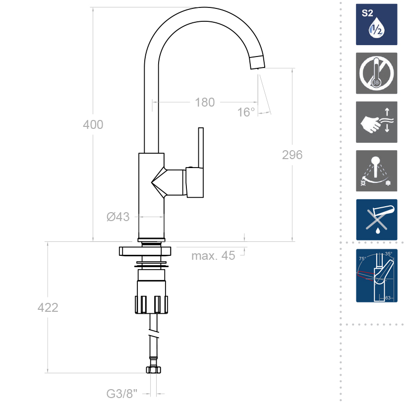 Коллекция Drako - изысканная классика ramonsoler., выполненная по принципу "гениальность в простоте". Аккуратный рычаг позволяет визуально сохранять пространство в интерьере, освежить его и делать наполненнее, интереснее за счет смесителя. Все смесители коллекции Drako, оснащенные изливом, имеют наклон аэратора в 15%, что позволяет их использовать с любыми раковинами.