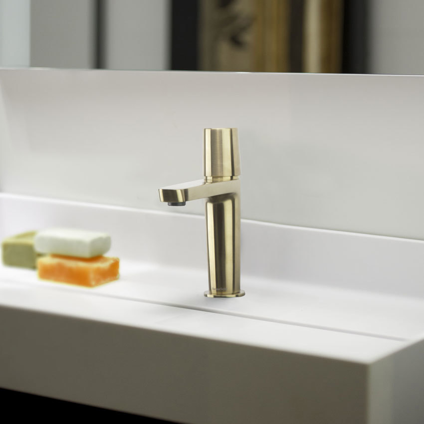 Ramonsoler Tzar Смеситель для раковины однорычажный, цвет: золото брашированное 340401OC и другие сантехнические изделия бренда характеризует надежность, высокое качество и продолжительный срок службы. Изделие в стилистике минимализм впечатляюще будет смотреться в различных цветовых решениях помещения.