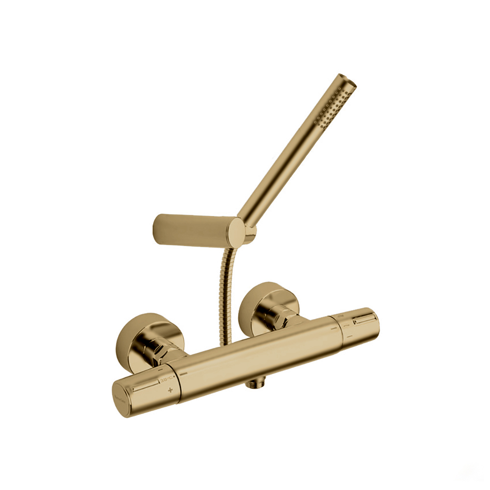 Ramonsoler Tzar Термостатический смеситель настенный с душем, цвет: золото брашированное 343401DOC и другие сантехнические изделия бренда характеризует надежность, высокое качество и продолжительный срок службы. Изделие в стилистике минимализм впечатляюще будет смотреться в различных цветовых решениях помещения.