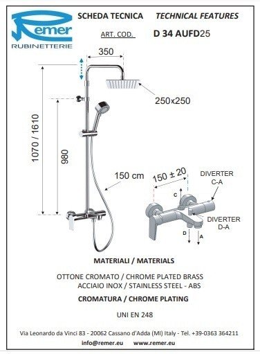 Remer Dream Душевая стойка: смеситель, верхний душ 25 см, лейка, штанга 161 см, шланг, цвет: cromo D34AUFD25 и другие сантехнические изделия бренда характеризует надежность, высокое качество и продолжительный срок службы. Изделие в стилистике минимализм впечатляюще будет смотреться в различных цветовых решениях помещения.