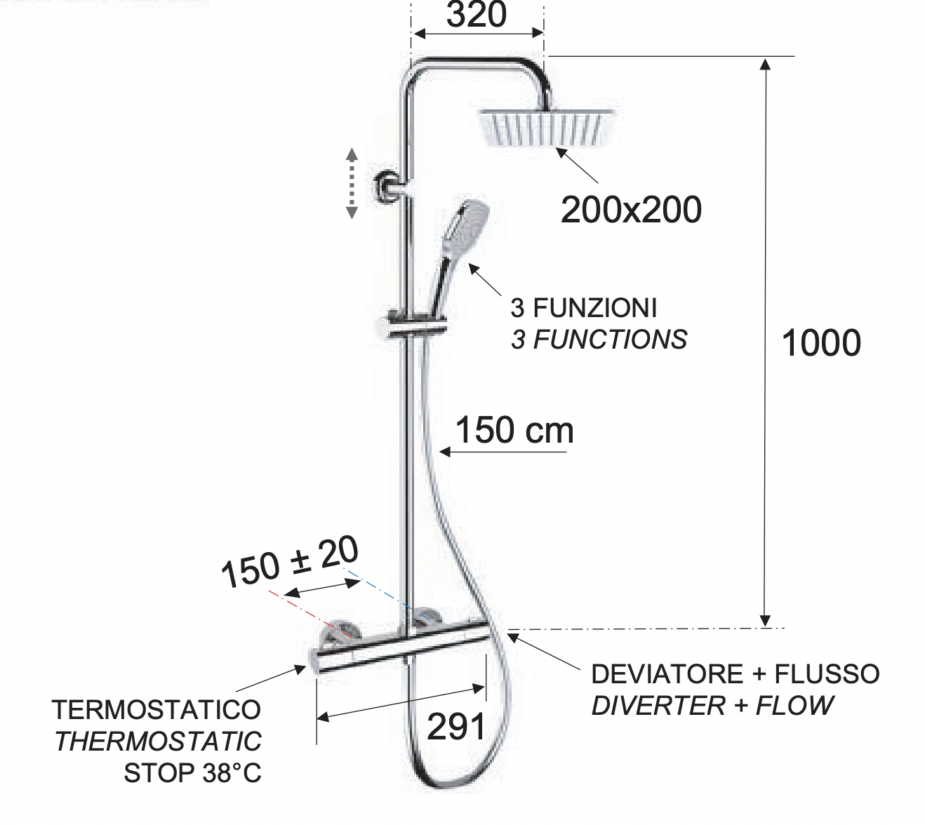 Remer Elegance Душевая стойка: термостат, верхний душ 20 см, лейка, штанга 100 см, цвет: cromo EQ32X8CPUFD20 и другие сантехнические изделия бренда характеризует надежность, высокое качество и продолжительный срок службы. Изделие в стилистике минимализм впечатляюще будет смотреться в различных цветовых решениях помещения.