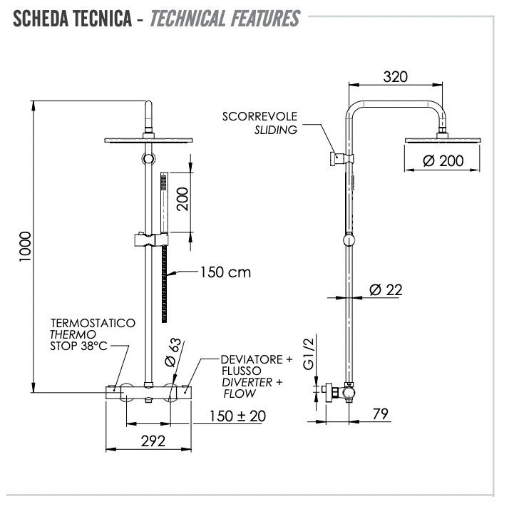 Remer Elegance Душевая стойка: термостат, верхний душ 20 см, штанга 100 см, цвет: oro spazzolato EQ32X7MMM20BG и другие сантехнические изделия бренда характеризует надежность, высокое качество и продолжительный срок службы. Изделие в стилистике минимализм впечатляюще будет смотреться в различных цветовых решениях помещения.