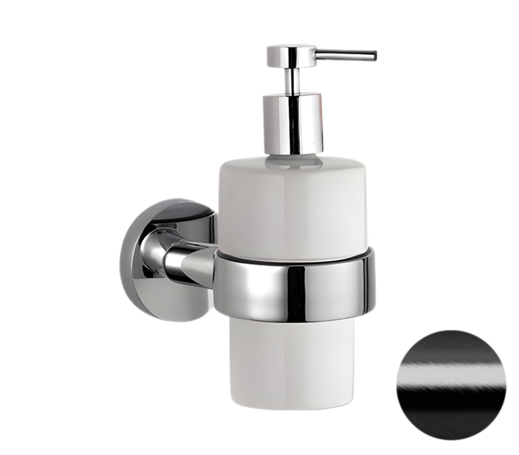 Remer Guest Дозатор для жидкого мыла, подвесной, керамическая колба, цвет: cromo nero spazzolato GS13CFP и другие сантехнические изделия бренда характеризует надежность, высокое качество и продолжительный срок службы. Изделие в стилистике лофт впечатляюще будет смотреться в различных цветовых решениях помещения.