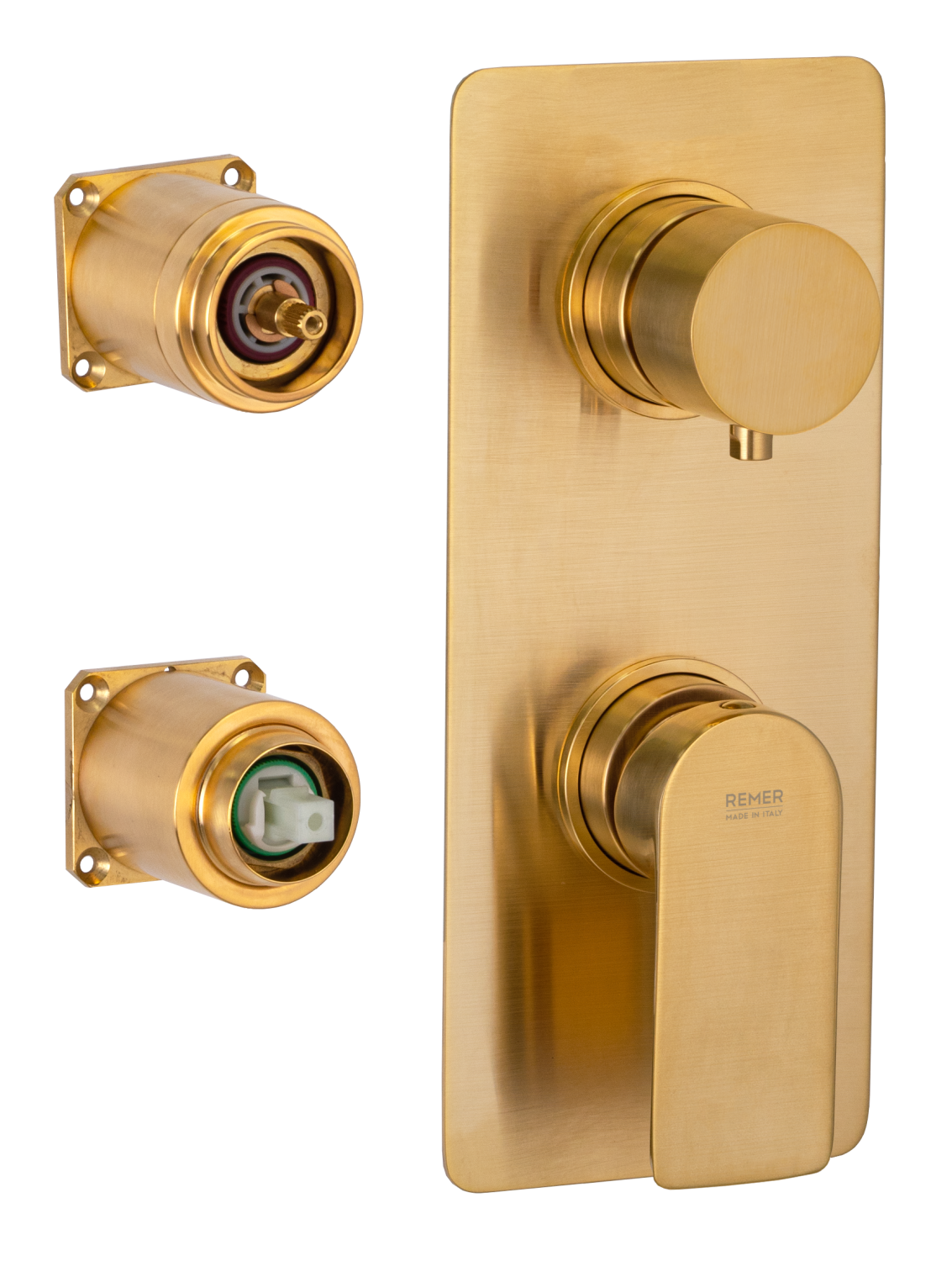 Remer Infinity Смеситель для ванны встраиваемый, 2 потребителя, внешняя часть, цвет: oro spazzolato I92KBBG и другие сантехнические изделия бренда характеризует надежность, высокое качество и продолжительный срок службы. Изделие в стилистике неоклассика впечатляюще будет смотреться в различных цветовых решениях помещения.