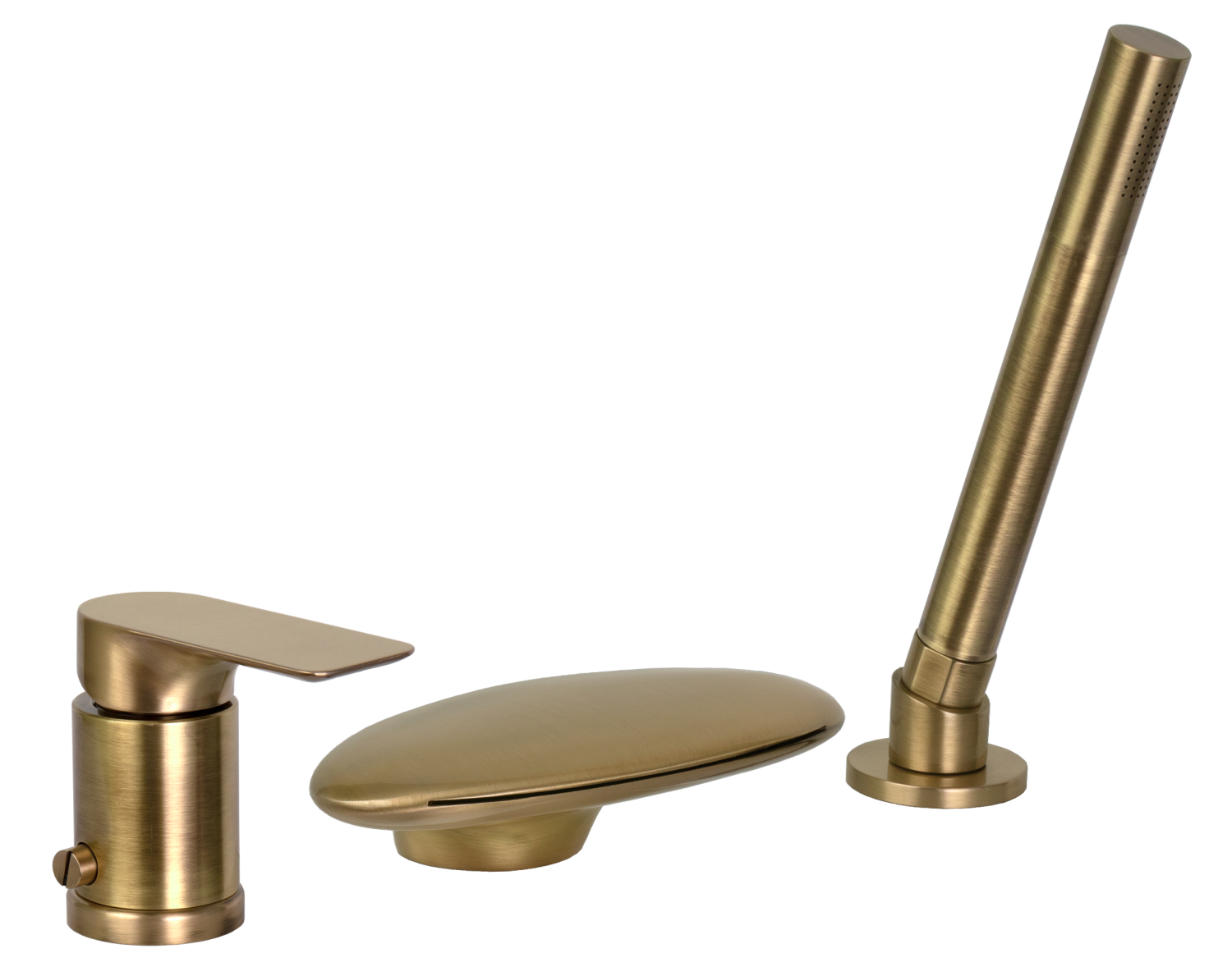 Remer Infinity Смеситель на борт ванны, каскадный излив, лейка 4 режима, шланг, цвет: vecchio ottone I07UFVO и другие сантехнические изделия бренда характеризует надежность, высокое качество и продолжительный срок службы. Изделие в стилистике лофт впечатляюще будет смотреться в различных цветовых решениях помещения.