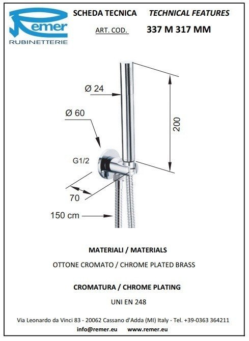 Remer Душевой гарнитур: лейка, выпуск с держателем, шланг 150 см, цвет: nichel spazzolato opaco 337M317MMNP и другие сантехнические изделия бренда характеризует надежность, высокое качество и продолжительный срок службы. Изделие в стилистике минимализм впечатляюще будет смотреться в различных цветовых решениях помещения.