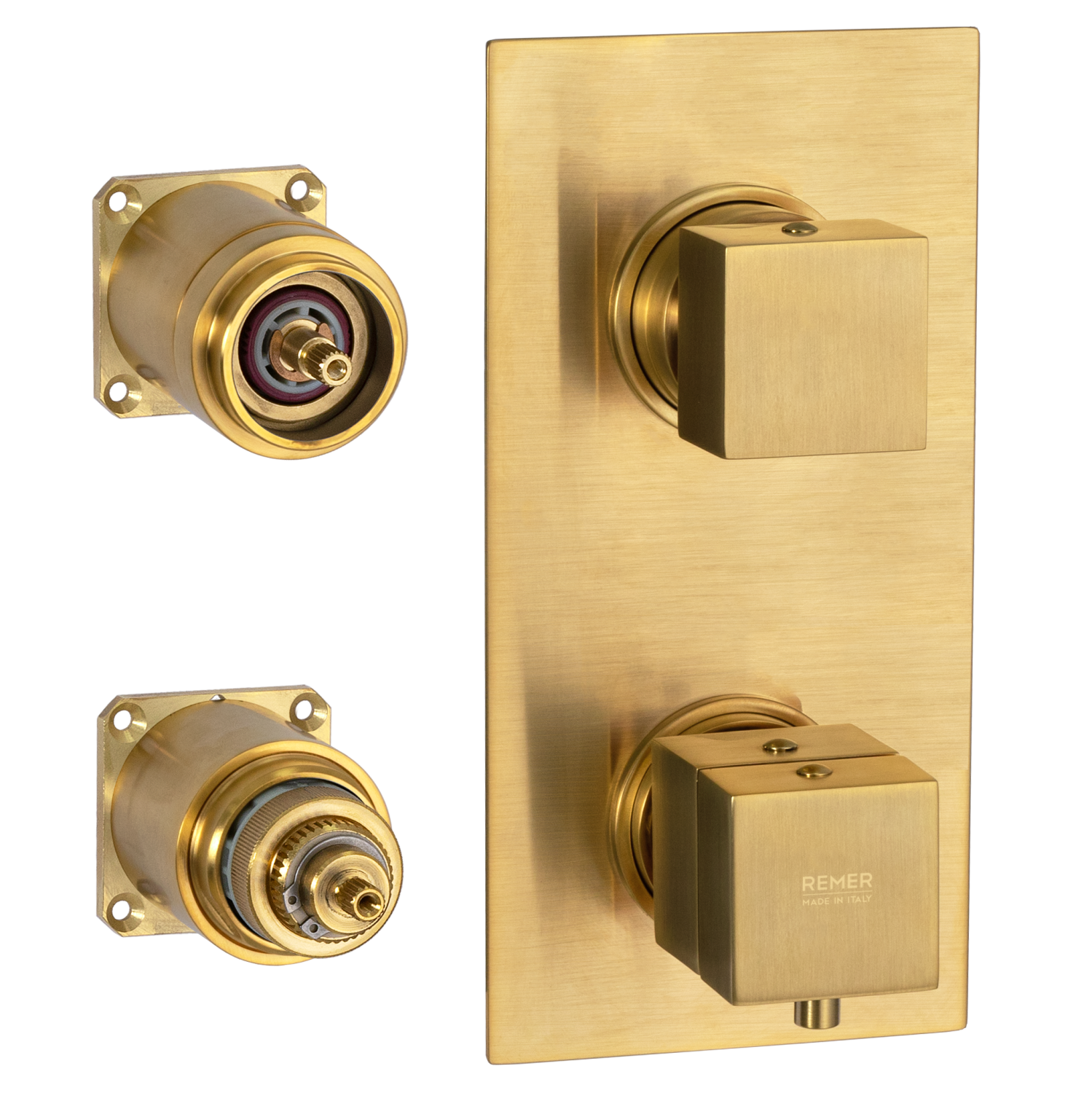Закажите Remer Q-Elegance Термостат для ванны встраиваемый 3 потребителя, внешняя часть, цвет: oro spazzolato QT93KBBG от производителя Remer, коллекция Q-Elegance в салоне европейской сантехники Дизайн Сантехники с быстрой доставкой по Москве. Представлены подробные характеристики и фотографии, которые позволят сделать правильный выбор и заказать товар.