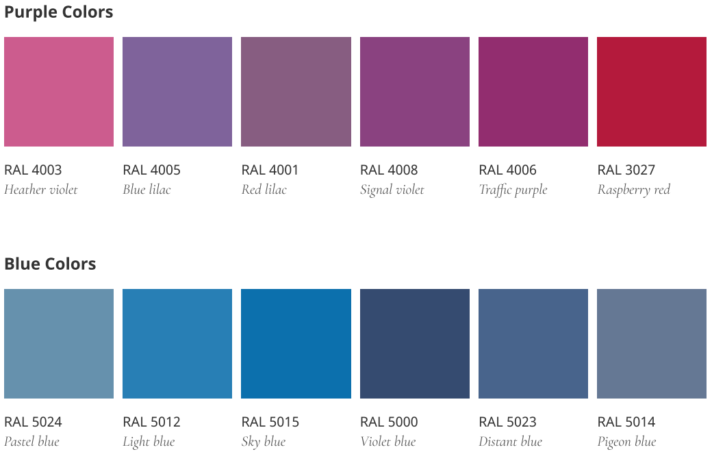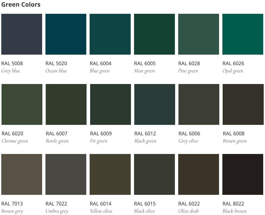 Черный: RAL 9005; Цветной - любой RAL *При выборе темных оттенков RAL проконсультируйтесь с менеджером по нюансам эксплуатации и ухода.;