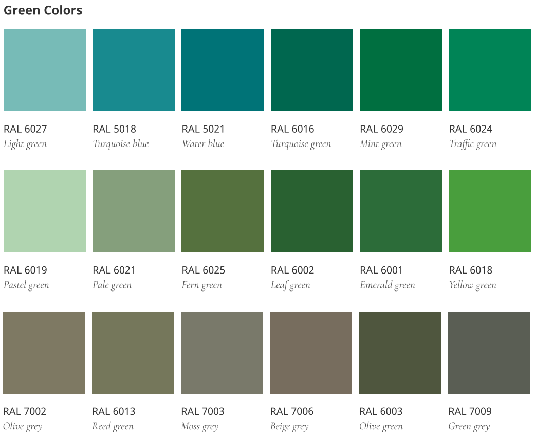 Черный: RAL 9011; Цветной - любой RAL *При выборе темных оттенков RAL проконсультируйтесь с менеджером по нюансам эксплуатации и ухода.;