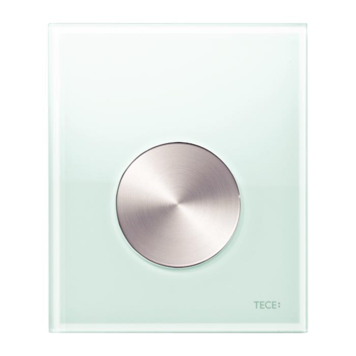 Tece Loop Кнопка смыва с покрытием от отпечатков, стекло, цвет: мятный зеленый/нерж. сталь, сатин 9242662 и другие сантехнические изделия бренда характеризует надежность, высокое качество и продолжительный срок службы. Изделие в стилистике минимализм впечатляюще будет смотреться в различных цветовых решениях помещения.