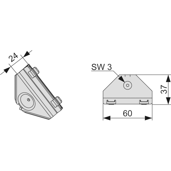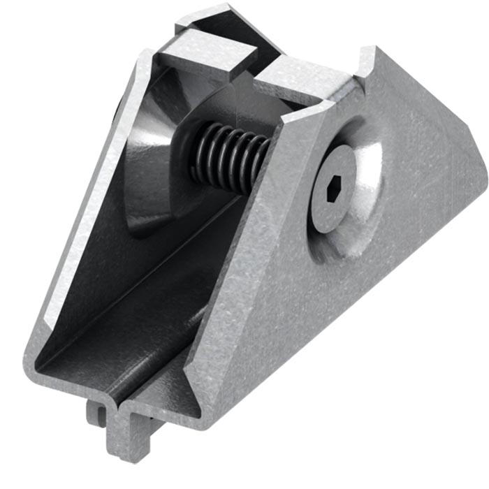 Угловое соединение для жесткого прямоугольного соединения профилей Tece Profil; блок в сборе из оцинкованной стали; винт под торцевой ключ M5 (SW 3) и нажимная пружина.