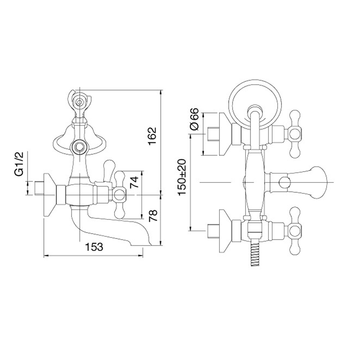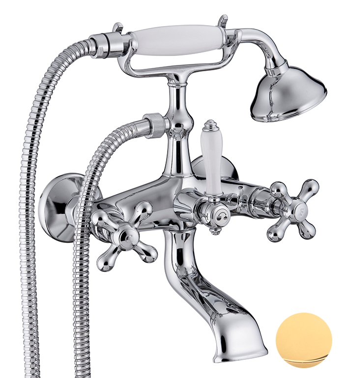 Treemme Romantica Смеситель для ванны настенный, ручки PV, цвет: золото/керамика 3601DDPV и другие сантехнические изделия бренда характеризует надежность, высокое качество и продолжительный срок службы. Изделие в стилистике прованс впечатляюще будет смотреться в различных цветовых решениях помещения.